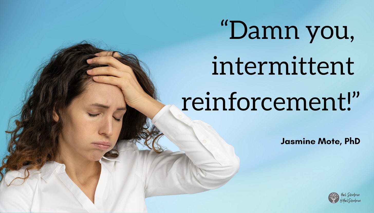 I have two kids under four, and mostly I think about intermittent reinforcement because I inadvertently do it all the time (to my annoyance).1 When my son asks to watch one more episode of Dinosaur Train after I’ve already said we’re done with TV, or my daughter asks for fruit snacks for breakfast (when we usually say no), and I give in only once or twice, I’m intermittently reinforcing behaviors that will become harder and harder to stop. This is particularly problematic when I give in after my kids have a bit of a tantrum—they inadvertently learn that tantrums can lead to what they want, even if I only cave every once in a while. Damn you, intermittent reinforcement!